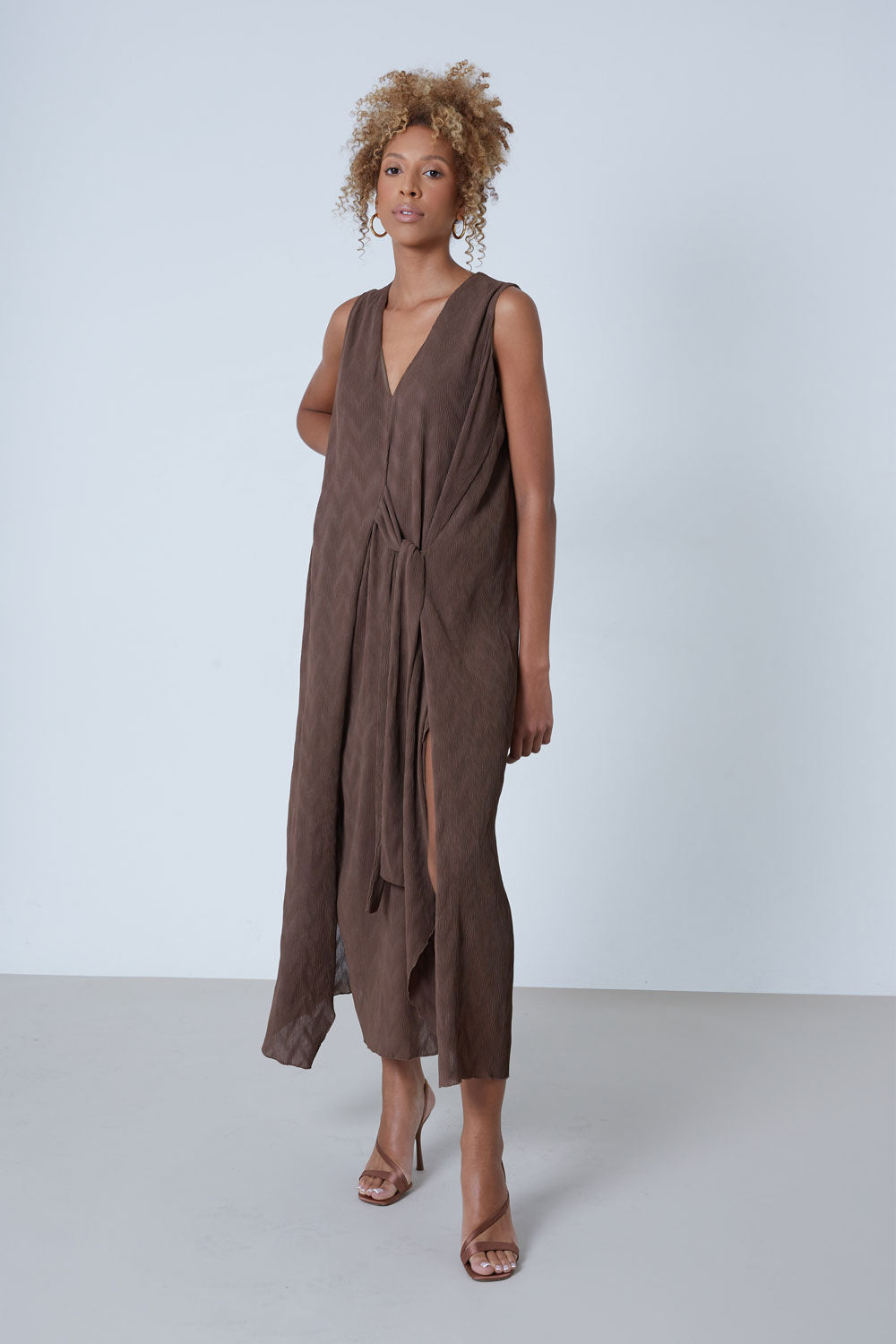 In a soft brown colour way, this maxi dress is cut from a textured lightweight fabric, it has a loose fit that can be cinched in with the tie waist belt detail.